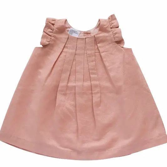 This sweet lined linen baby dress has four tiny box pleats at the neckline and adorable ruffled sleeves perfect for any outing, formal or casual.