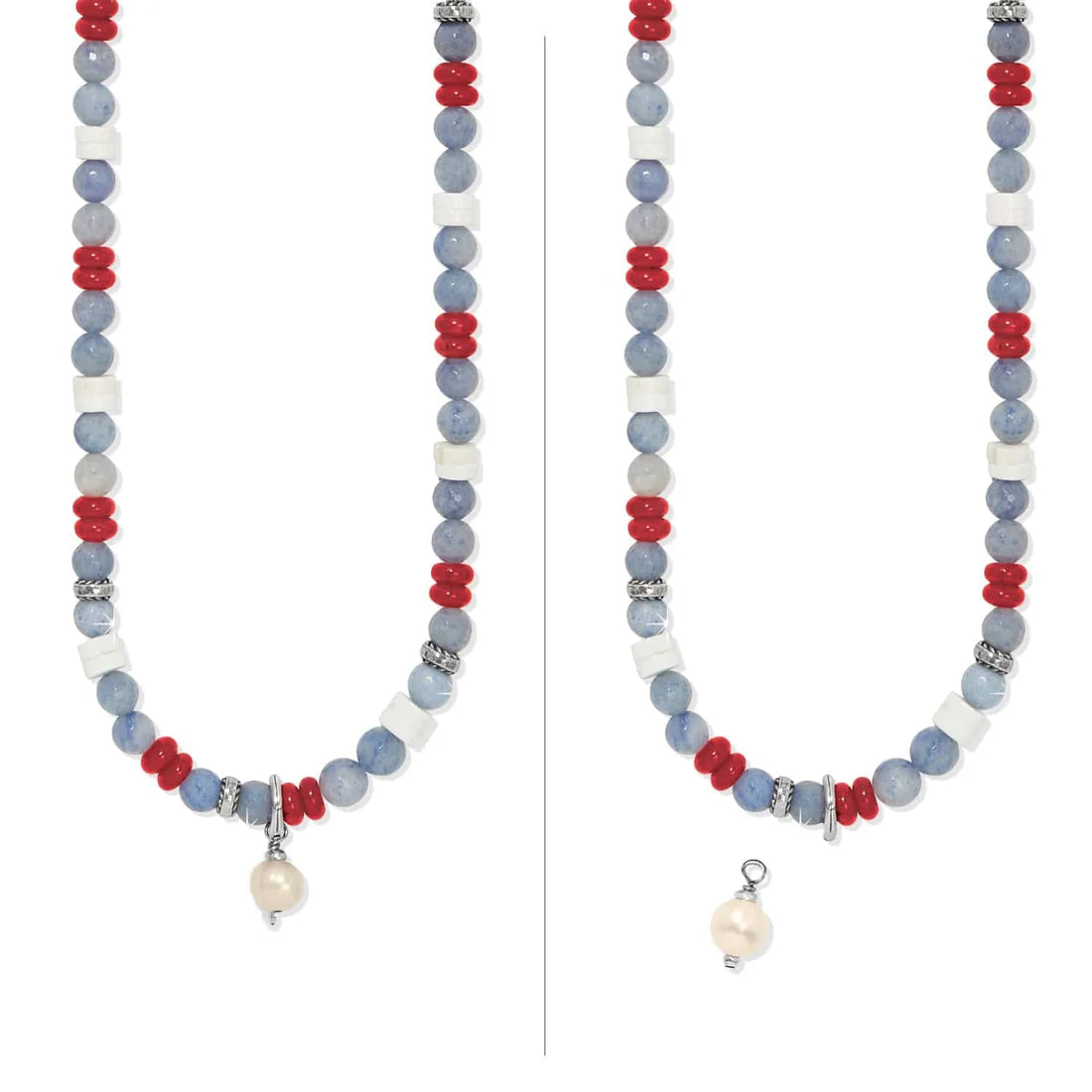White turquoise howlite, blue aventurine and red-dyed jade lend a patriotic touch to this pretty necklace that dangles a petite pearl charm.