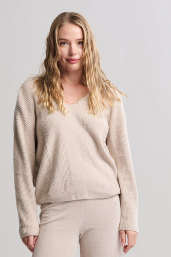 CozyChic Lite Ribbed V Pullover With Back Tie -Stone