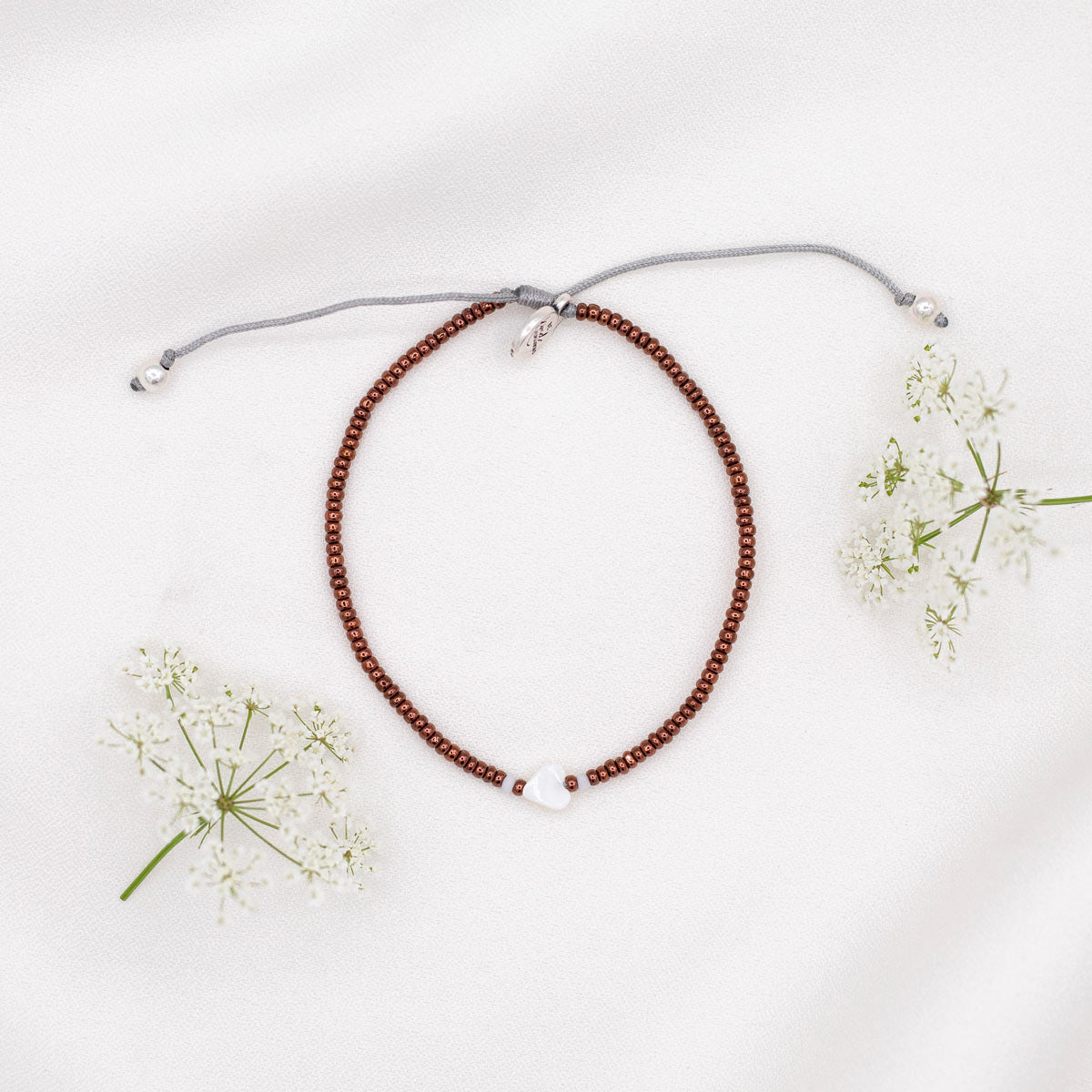 • Two-tone seed bead, mother of pearl heart bracelet