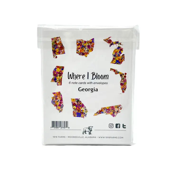 Printed notecards featuring Georgia-shaped artwork created from original farm-grown pressed flowers
