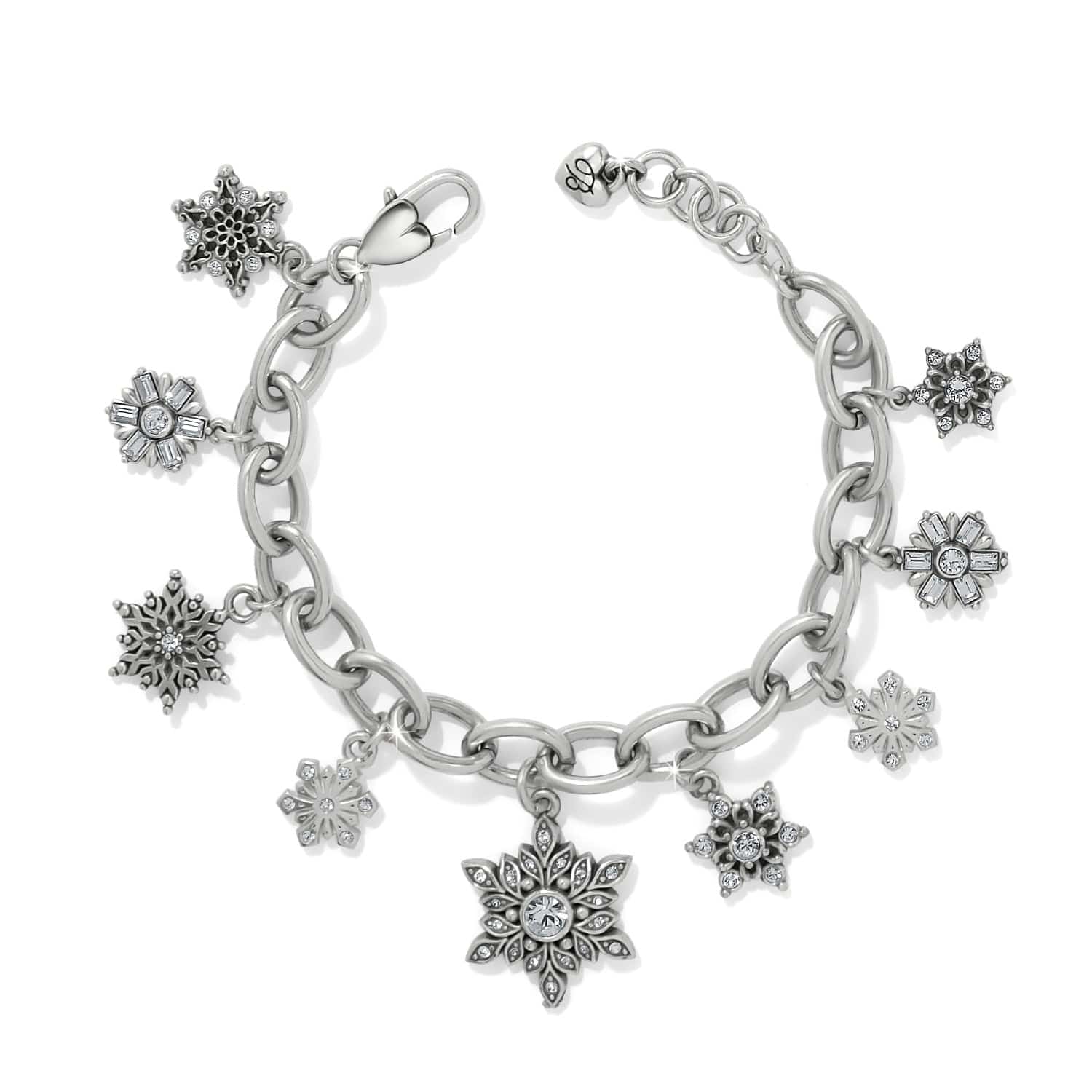 An array of beautifully sculpted snowflake charms dangle from a modern silver chunky chain, each one uniquely detailed to reflect nature’s frosty artistry. Crystal accents enhance artisan-etched details from delicate filigree to bold three-dimensional forms.
