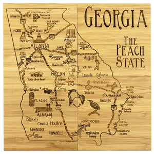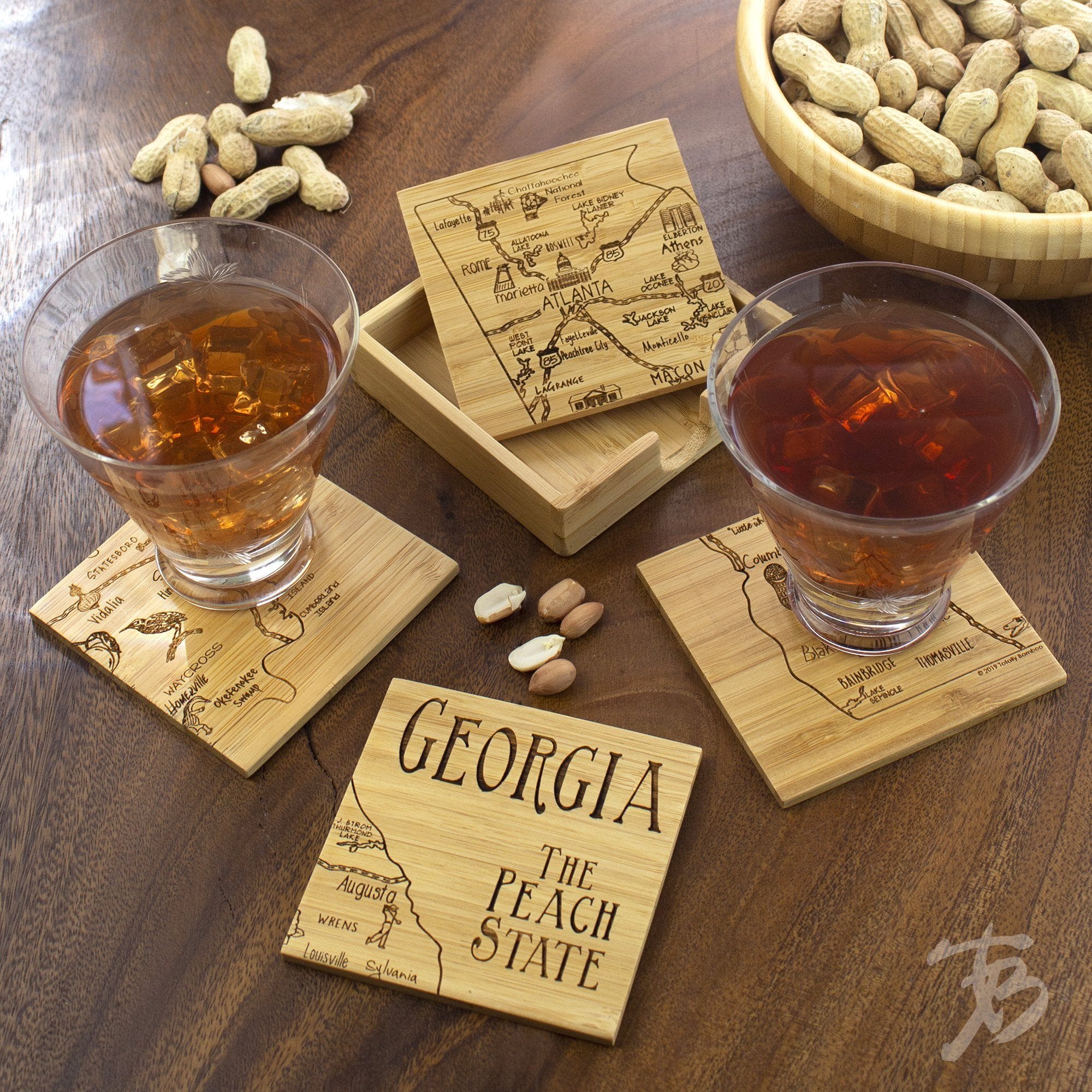 Celebrate The Peach State while keeping tables safe from water marks with the Totally Bamboo Georgia State Puzzle 4 Piece Bamboo Coaster Set with Case. These sturdy bamboo coasters feature laser engraved artwork of Georgia that highlights all the memorable sights and places that make the state great: from Atlanta to Savannah, Rome to Athens, The Okefenokee Swamp to Chattahoochee Forest and everywhere in between! The "map" is spread out across the four coasters so when they are placed together it completes the picture. This "puzzle" theme makes for a great conversation piece at parties and get-togethers. The set includes a sturdy and handsome case to hold the coasters when they're not in use. Each coaster measures 4 inches by 4 inches to accommodate all popular glass sizes..